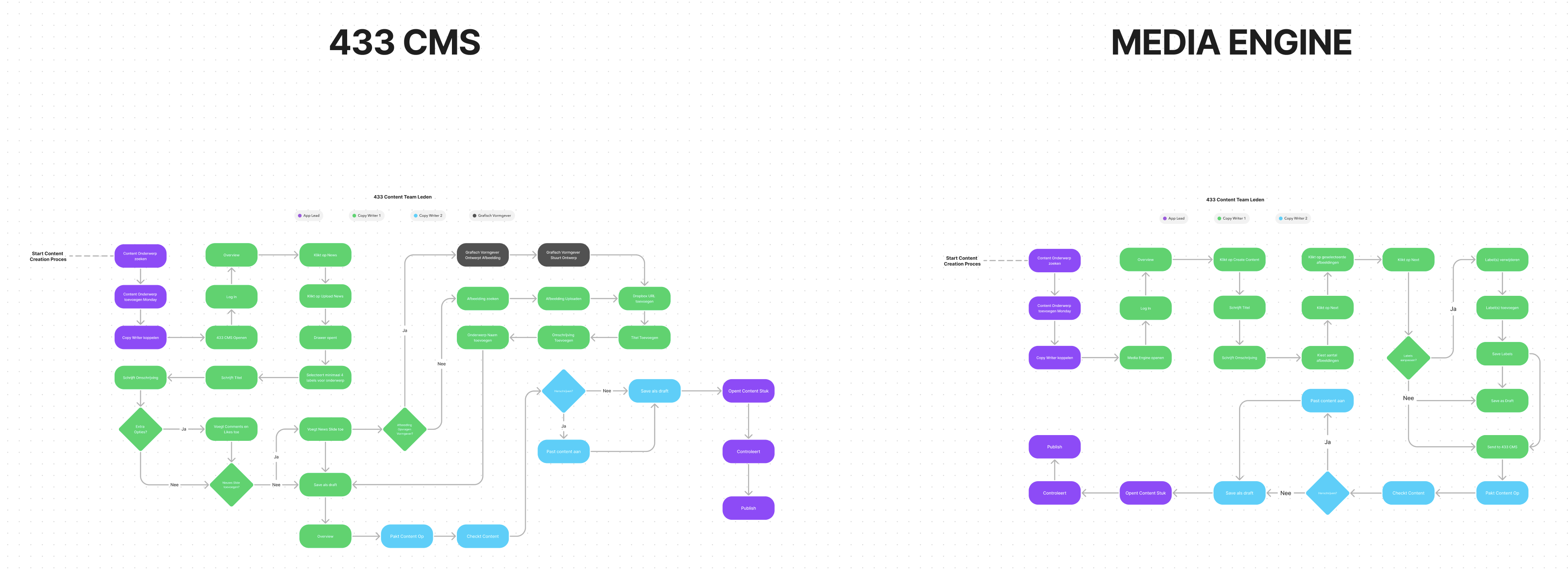 A significant part of the creation process involved analyzing the flowchart of the current system, the 433 CMS, and designing a new flowchart for the Media Engine. The flowchart of the current system was mapped out in detail, including the roles and steps involved. Subsequently, an optimized flowchart for the Media Engine was developed, eliminating unnecessary steps and streamlining the process. This flowchart served as a visual guide for the design of the Media Engine, ensuring a more efficient and intuitive user experience.